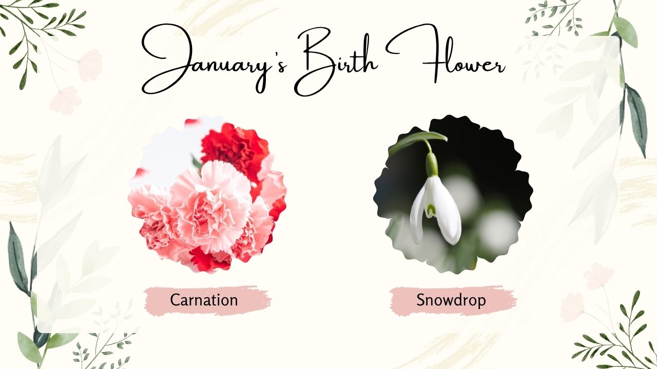 January’s birth flower is the carnation, with the snowdrop often recognized as a secondary birth flower for the month.